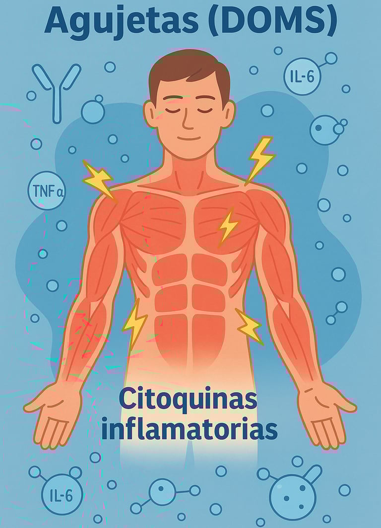 Cuando acabas un esfuerzo bestia, tu cuerpo libera sustancias inflamatorias (cytokina, para que nos entendamos, los mensajeros químicos que avisan de que algo se ha roto un poquito). Resultado: hinchazón, dolor sordo y rigidez que te convierten en pingüino durante un par de días.